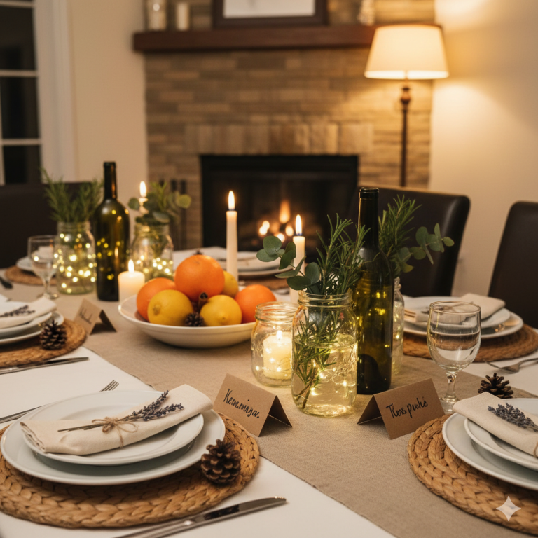 Știai că nu ai nevoie de decorațiuni scumpe pentru a crea o atmosferă de neuitat? Uneori, simplitatea obiectelor obișnuite creează magie. De exemplu, borcanele de sticlă rămase de la alimentele conservate pot deveni suporturi elegante pentru lumânări. Adaugă un pic de sfoară naturală și câteva crenguțe de rozmarin, iar atmosfera caldă și primitoare va fi instantanee.