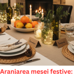 Câteva lămpi de Crăciun, așezate cu grijă printre farfurii și tacâmuri, pot transforma o cină obișnuită într-o sărbătoare luminoasă. Poți, de asemenea, să folosești fructe de sezon pentru un impact vizual plăcut—mandarinele sau merele plasate într-un bol simplu din ceramică aduc un strop de culoare și prospețime.